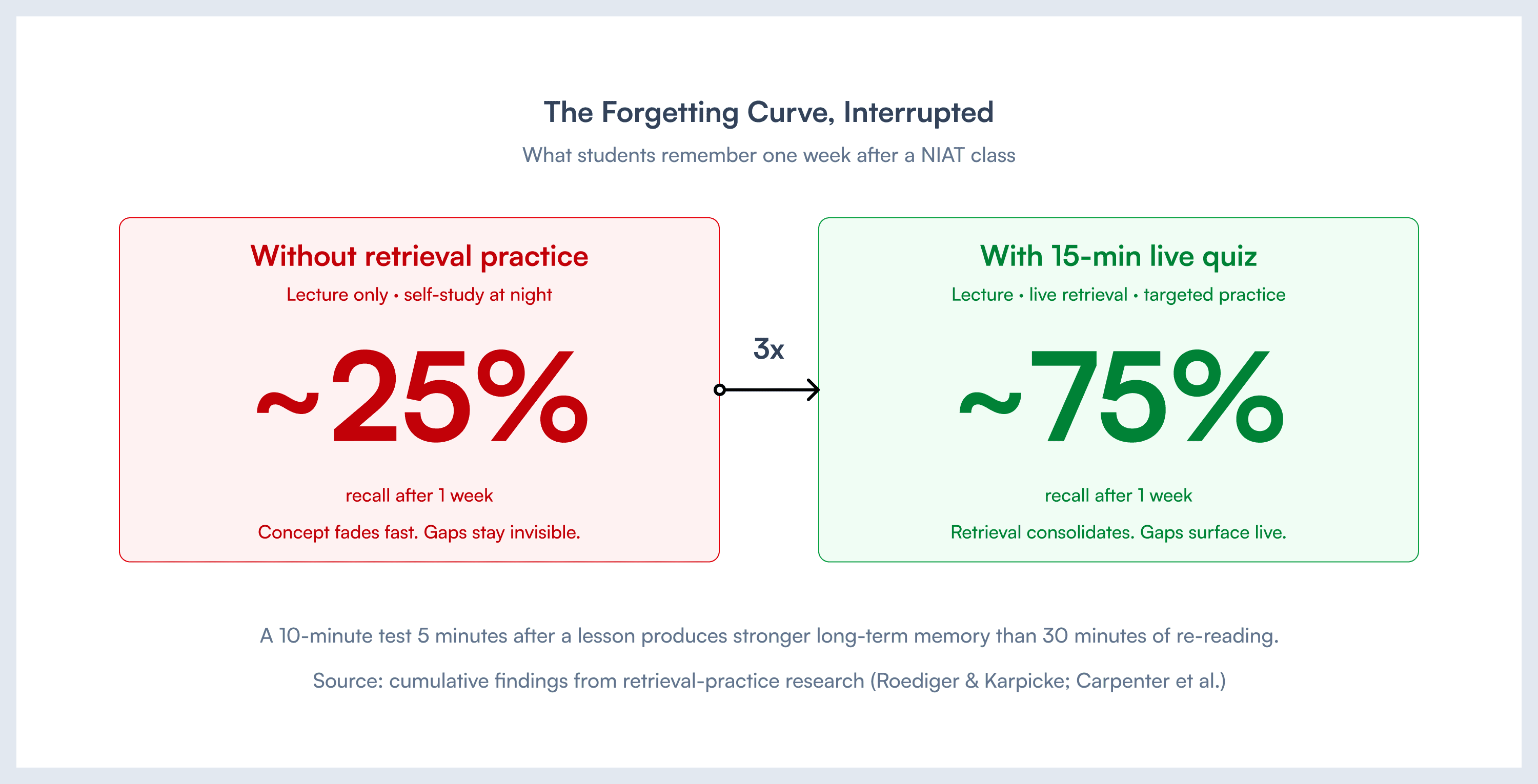 A short test soon after a lesson produces stronger long-term memory than a much longer re-reading session. The brain consolidates what it had to produce, not what it merely recognised. The retention gap at the one-week mark is dramatic. And one week is exactly when the weekly assessment runs.