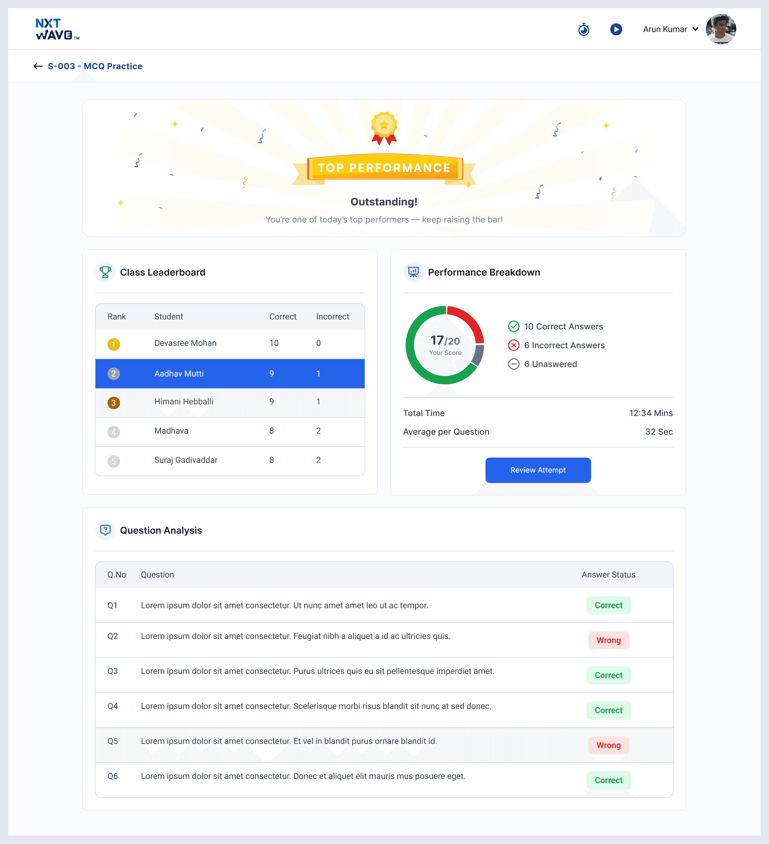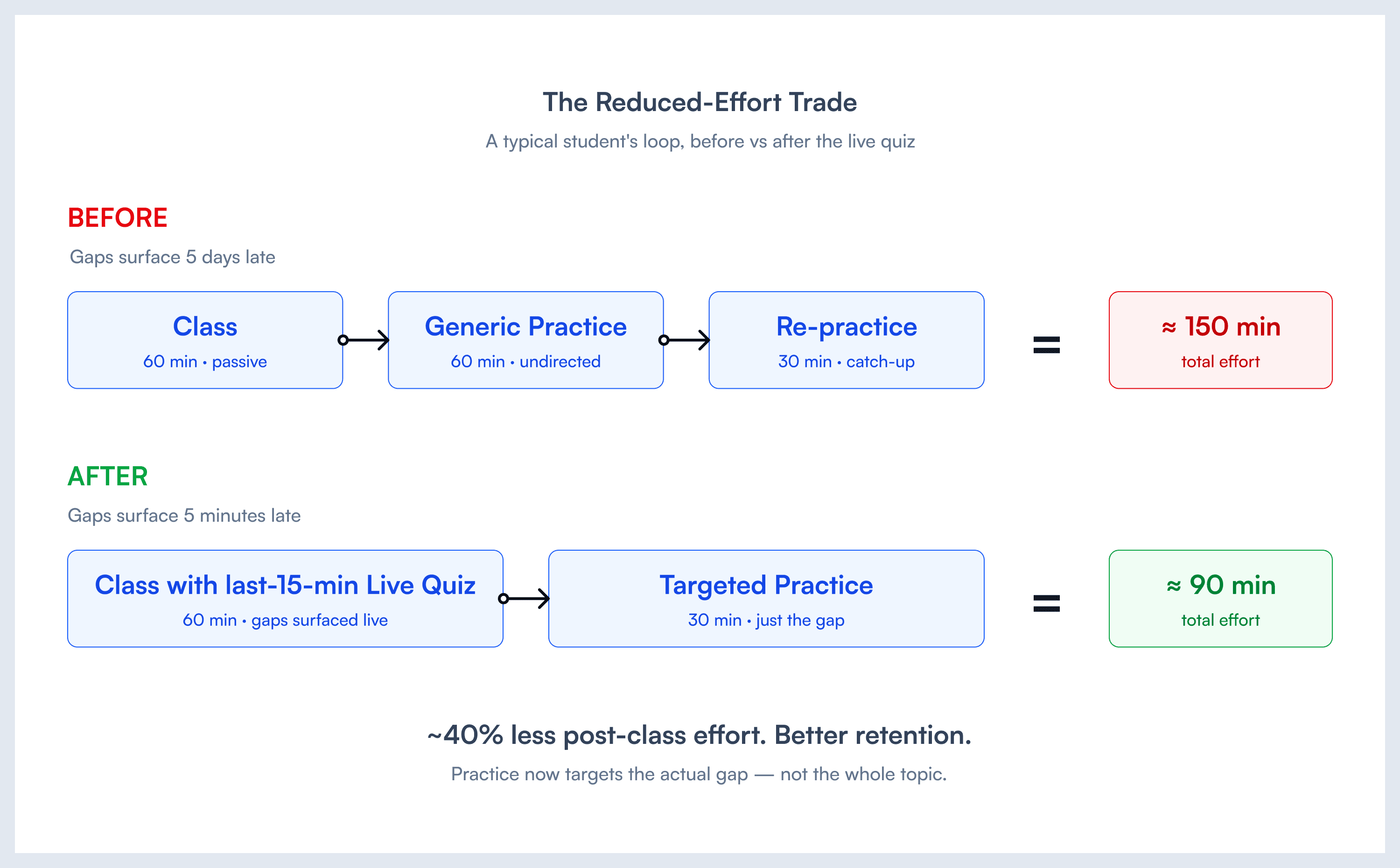 Less time on undirected practice. More time spent on the gaps the live quiz surfaced minutes after the class ended — long before the weekly assessment ever arrived.