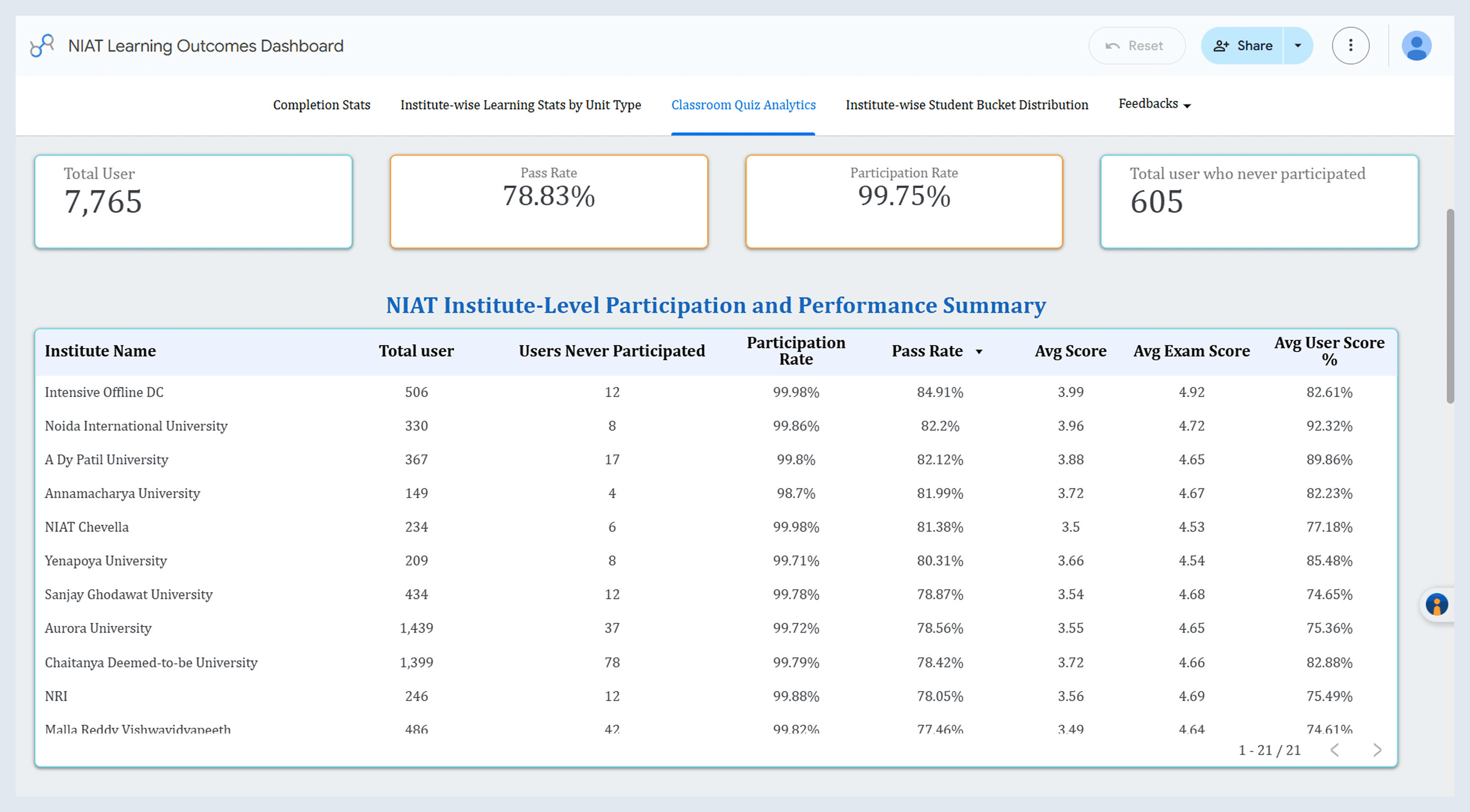 Participation rate sits at 99.75% across nearly eight thousand active users. The live format pulled the long tail of disengaged students into the room. Average pass rate is 78.84% with a healthy spread — 70% to 82% across institutes. The spread itself is now a usable diagnostic. Institutes at the lower end can be coached using sectional data we never had before. User Score % ranges from 68.89% to 92.32% across institutes on identical curriculum. Pre-launch, this gap was invisible until the weekly tests ran. Post-launch, instructors see it within minutes of the class ending.