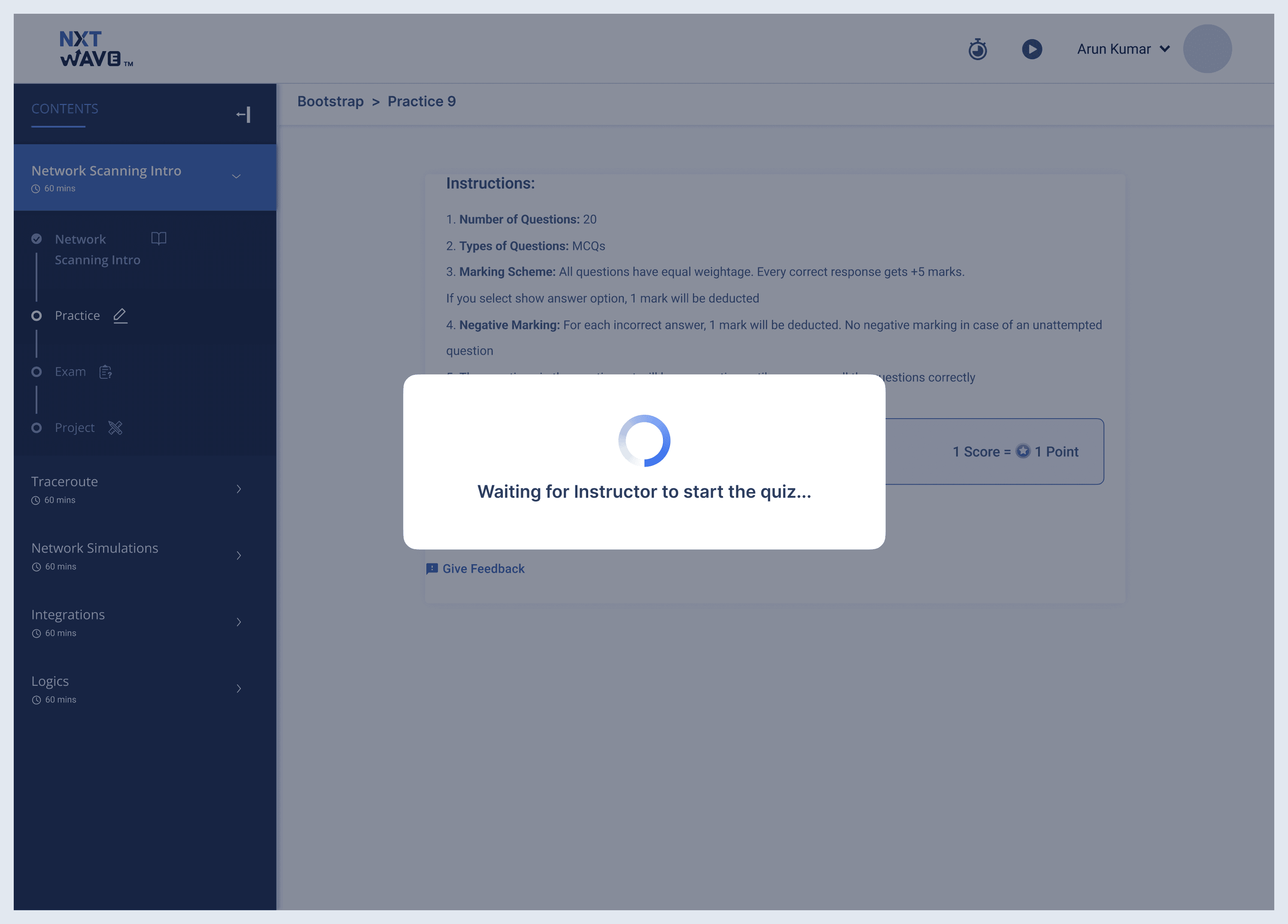 After joining, the student sees a holding screen until the instructor starts the quiz.