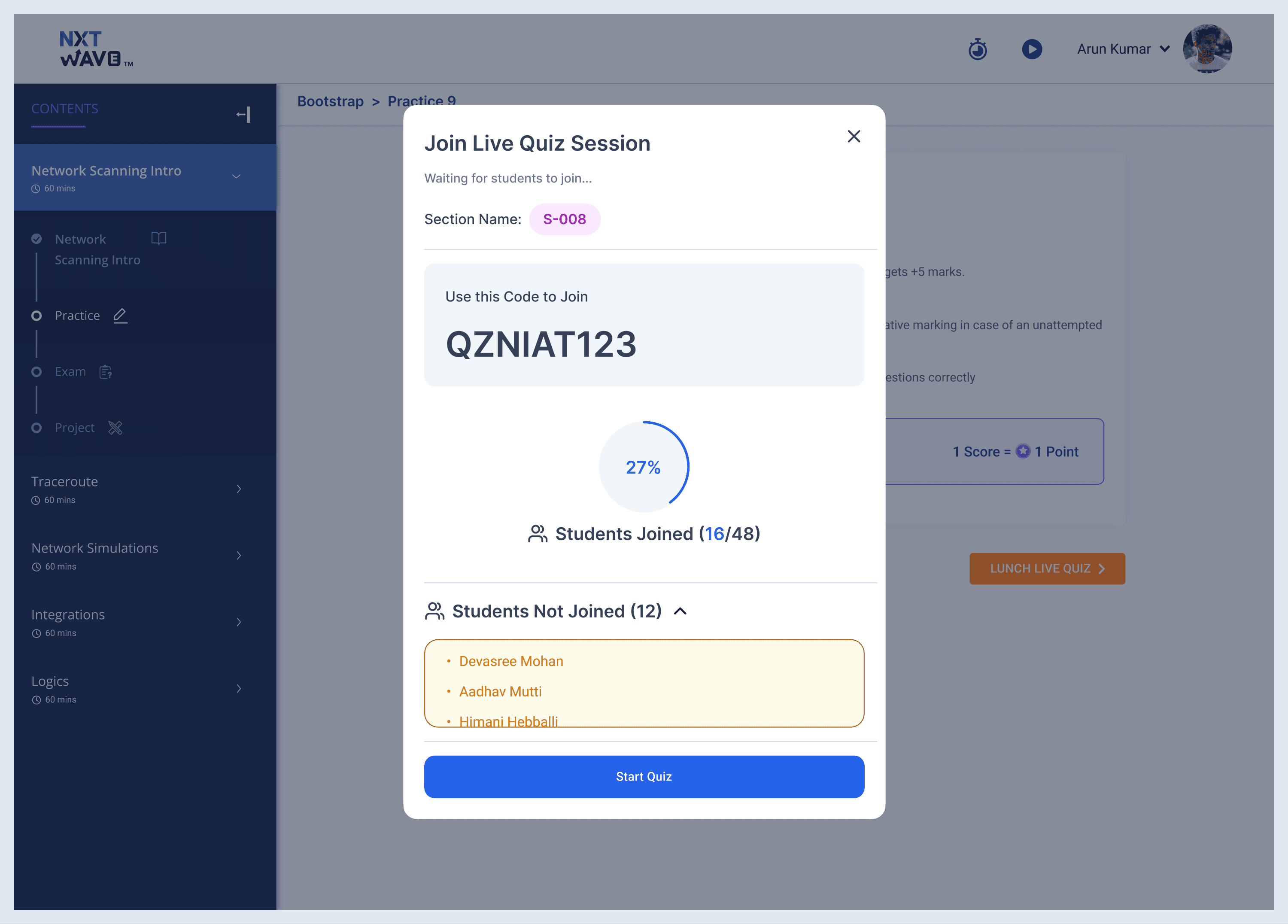 The section name is shown at the top of the modal. This sounds trivial. It isn't. Instructors at NIAT often teach the same unit to multiple sections in a day. Showing the section name prevents launching the wrong session for the wrong batch.