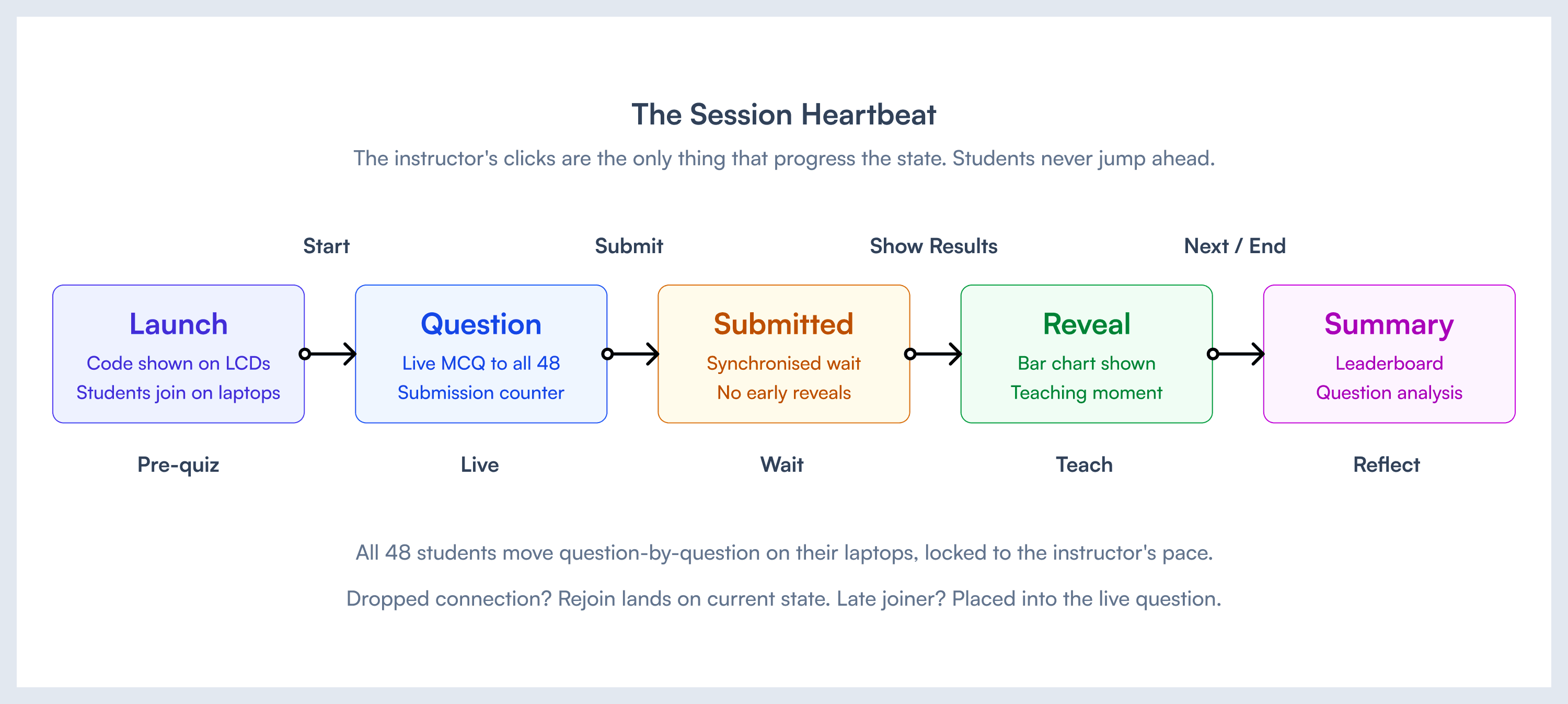 The teach phase is the instructor's domain. Whiteboard, live coding, discussion, the long form of teaching that has been happening in classrooms for centuries. The live quiz phase is what we built. It's the consolidation rep that locks the teaching in.
