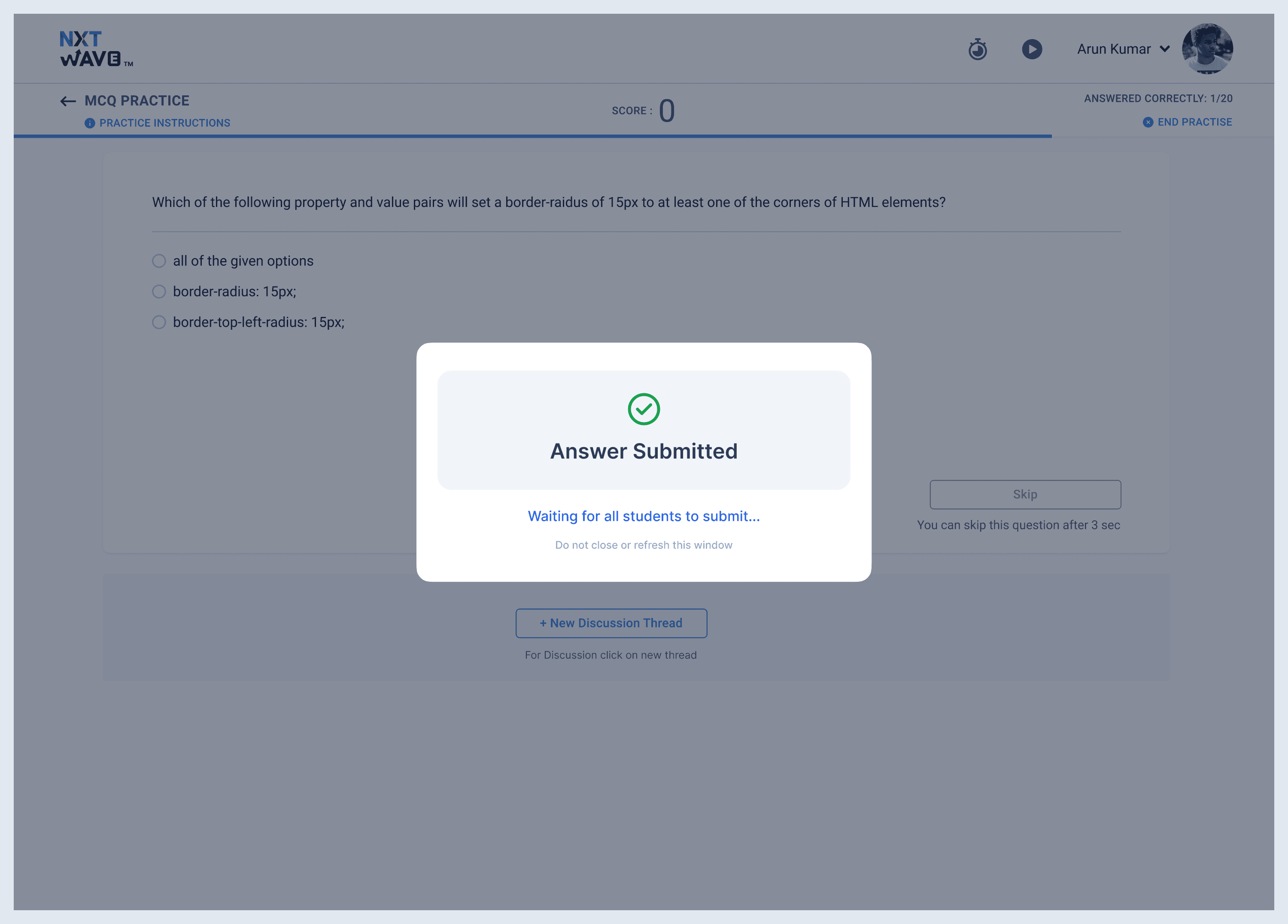 When the quiz begins, the student sees a screen that looks deliberately, almost boringly, like the Practice MCQ they already use every day.