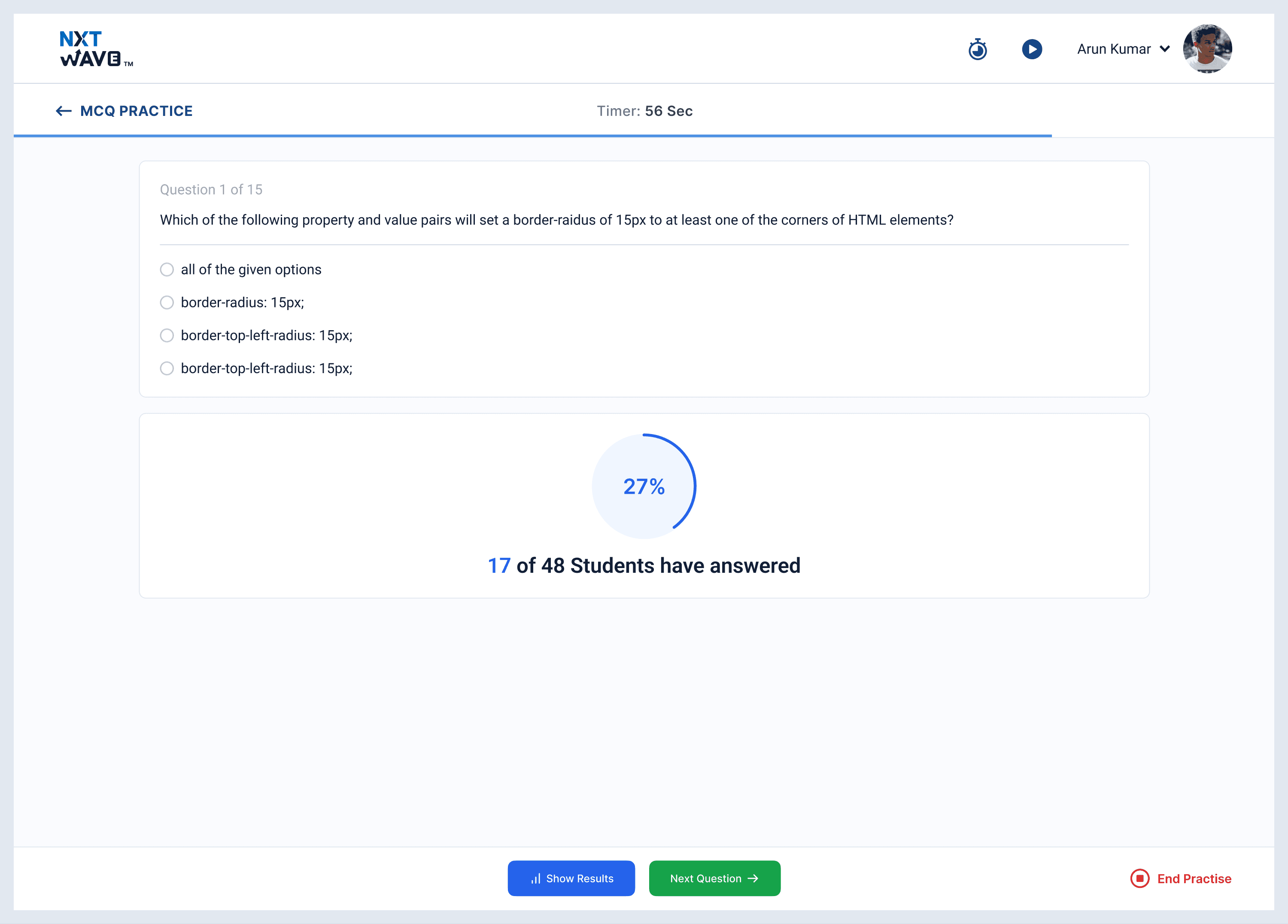 The instructor's clicks are the only thing that progress the state. Students never see the next question until the instructor moves the room forward. The system gracefully handles dropped connections, late joiners who walk in mid-quiz, and accidental "End Practise" clicks. The architecture sounds simple. It isn't.