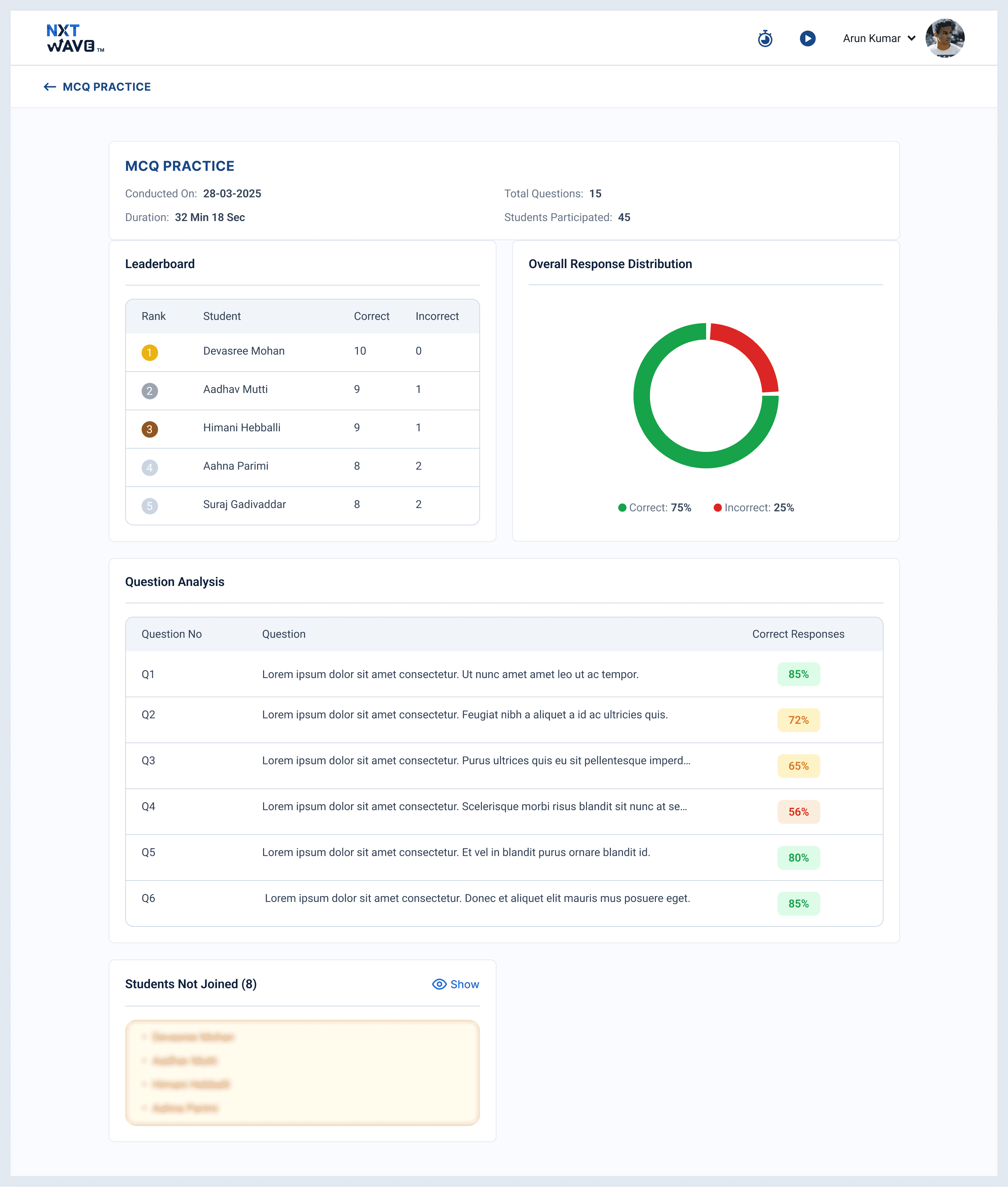 Three intentional choices on this screen. The leaderboard shows top five only — gold, silver, bronze for ranks one through three. The bottom of the table is not shown publicly. The question analysis colour-codes each question by percentage correct: green if at least 80%, yellow between 60 and 80, red below. The instructor knows at a glance what to revisit next class. And Students Not Joined is collapsed by default — visible for follow-up, not the headline of the screen.