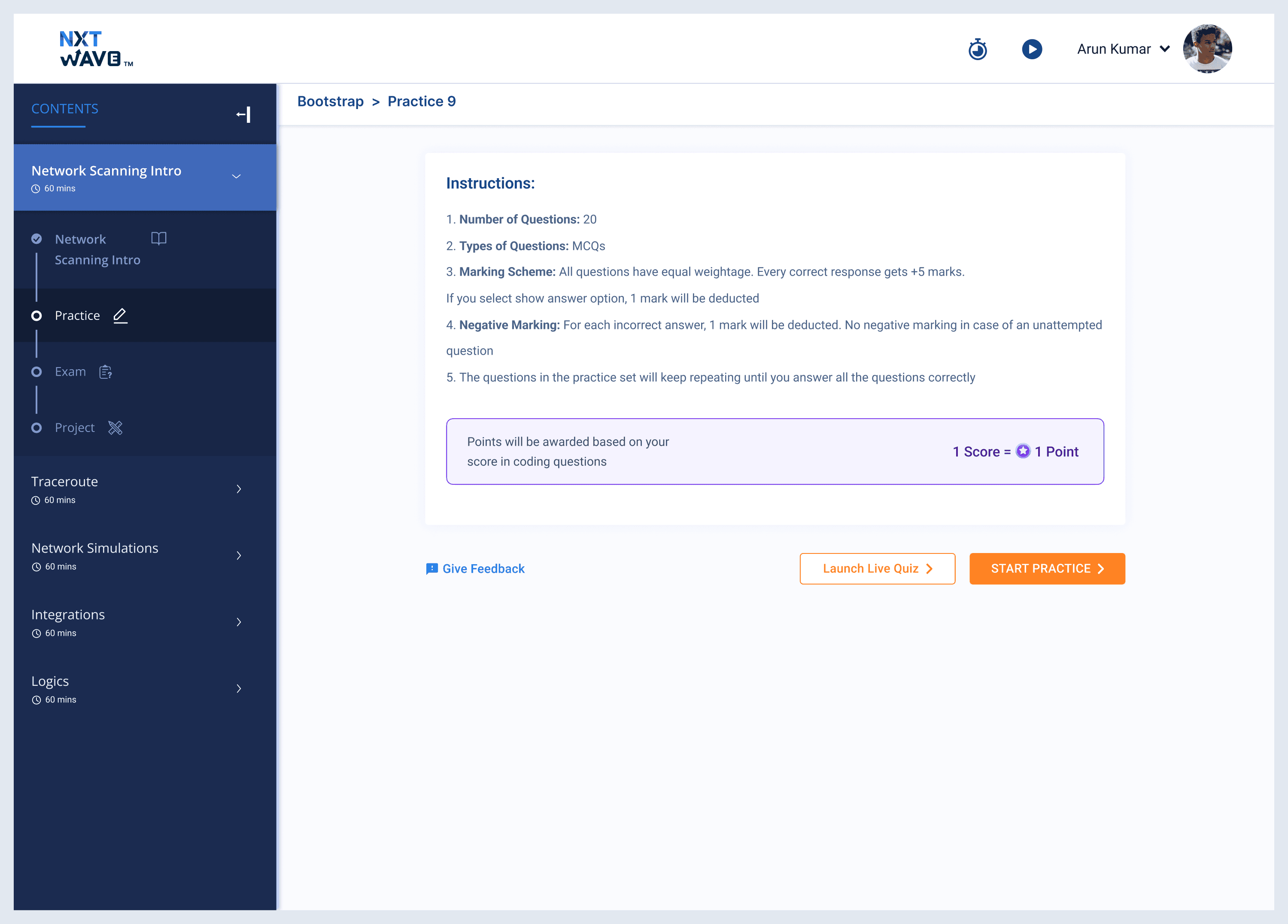 The instructor opens the same Practice page a student would. The only role-aware element is one button. Students see only Start Practice. Instructors see both Start Practice and Launch Live Quiz.