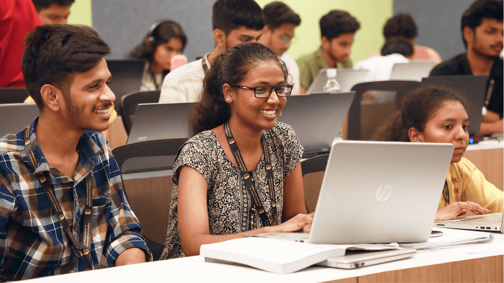 Every student in a NIAT classroom has a laptop in front of them. The learning platform is laptop-native. The classrooms are laptop-equipped. There are three big LCD displays at the front, dedicated A/V, and structured units. Every interaction described below — joining, answering, reviewing — happens on the same laptop the student was already taking notes on.