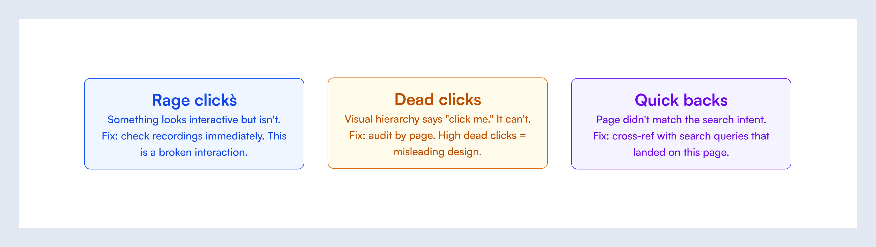 Quick backs are philosophically different from the other two. A user who quick-backs isn't frustrated by the page — they're frustrated by the mismatch between what the search result promised and what the page delivered. This is an SEO-UX alignment problem. The fix lives in your page titles, meta descriptions, and above-the-fold content — not in the CTA.