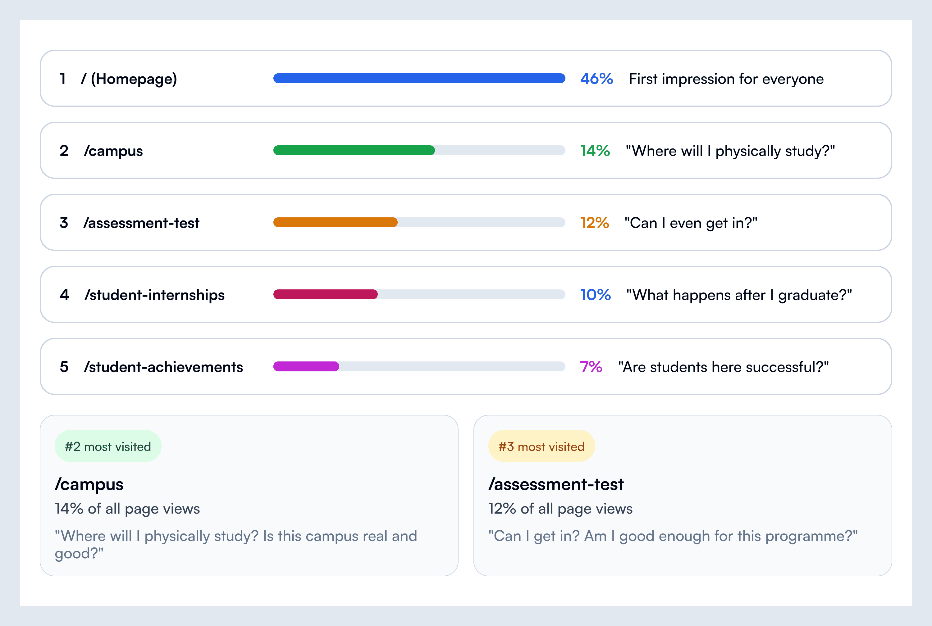 Both of these pages existed in our information architecture as deep navigation items — several clicks from the homepage. The analytics showed us they were actually the second and third most important pages on the site. We redesigned the homepage navigation and the campus page's conversion path based entirely on this.