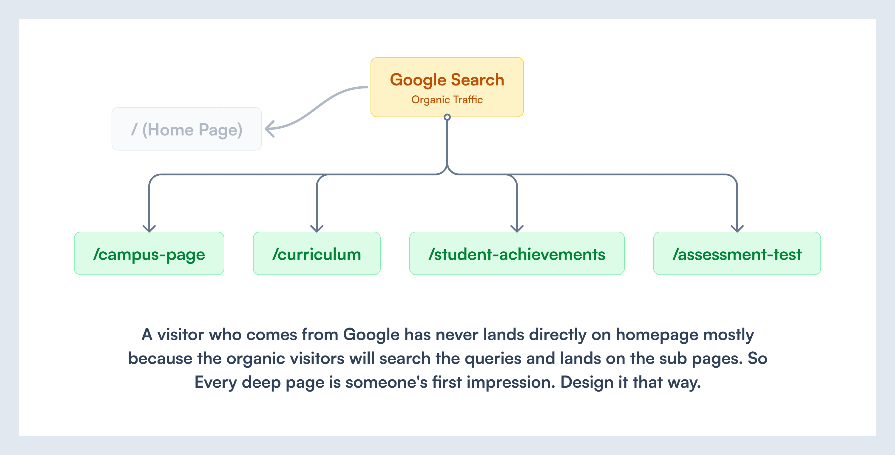 The analytics eventually showed me that a very significant portion of sessions were landing directly on deep pages — the campus page, the AI Bootcamp programme page, event pages, the assessment test page — often from organic search. These users never saw the homepage. Their first impression of the brand was whatever page Google served them.