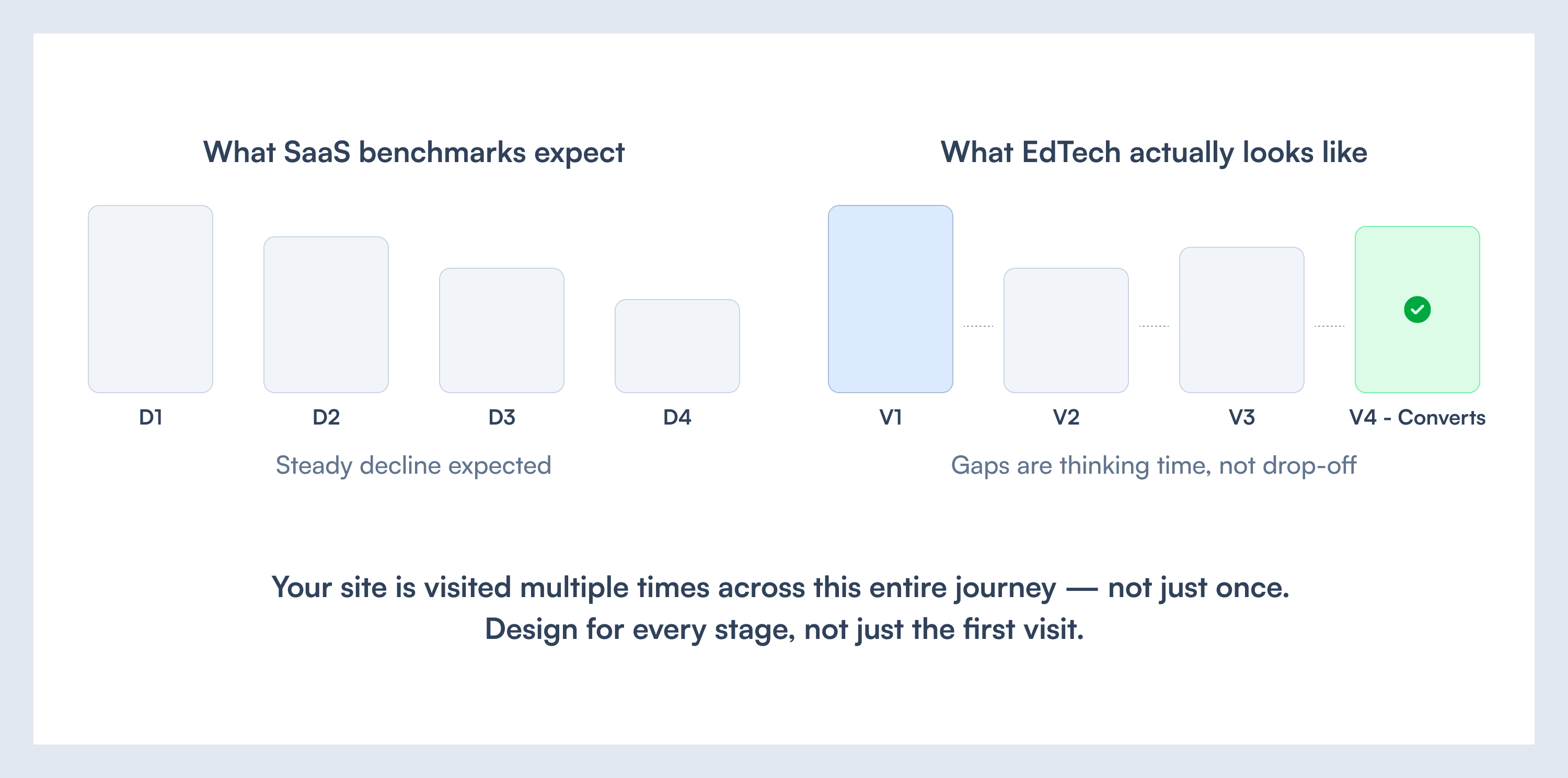 What does designing for this look like? It means every page needs to give someone a reason to come back. New content. Updated placement information. A downloadable resource. A comparison tool. Something that rewards the second and third visit rather than assuming conversion on the first.